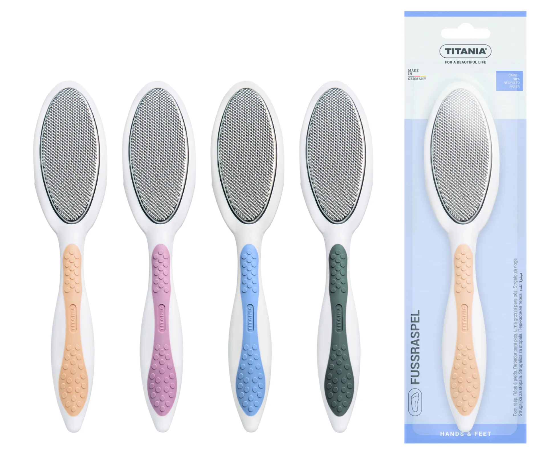 The ergonomically shaped TITANIA foot rasp with Softtouch handle ensures skinfriendly foot care with its abrasive surface and stainless rasp by gently and thoroughly removing calluses and hard skin. Use the coarse rubbing surface first and then the fine one for smoothing.